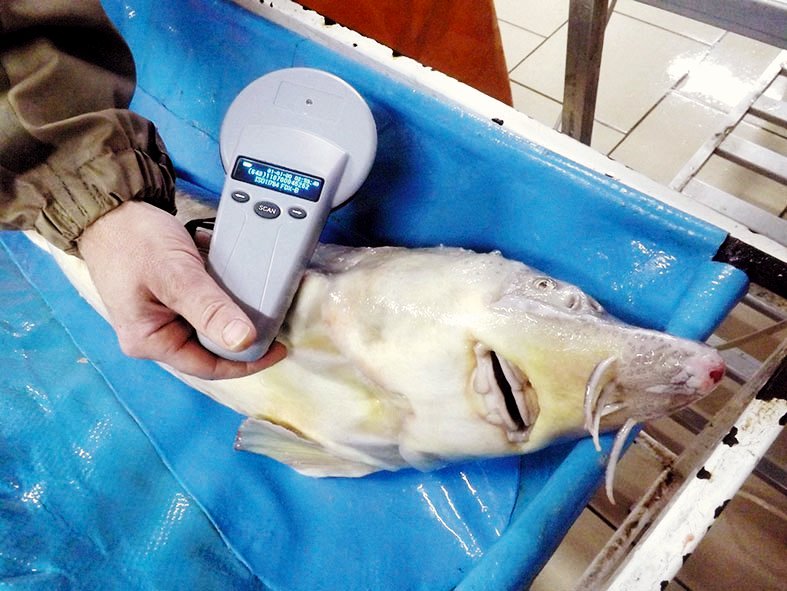 Интереснейшим моментом нашей экскурсии стала процедура ультразвукового исследования (УЗИ) осетра – это необходимо для определения степени зрелости рыбы, а также наличия у неё икры. Прямо возле бассейнов сотрудники комплекса во главе с главным рыбоводом Николаем Михайловым оперативно развернули необходимое оборудование и исследовательский стол, куда и поместили выловленного сачком из бассейна осетра. Десятикилограммовая рыбина показала свой нрав: укладывать её пришлось долго и чуть ли не втроём! Непосредственно УЗИ времени заняло куда меньше: специалисты оперативно получили всю необходимую информацию, а также продемонстрировали наличие у особи внедрённого в неё микрочипа, служащего рыбе неким подобием паспорта.